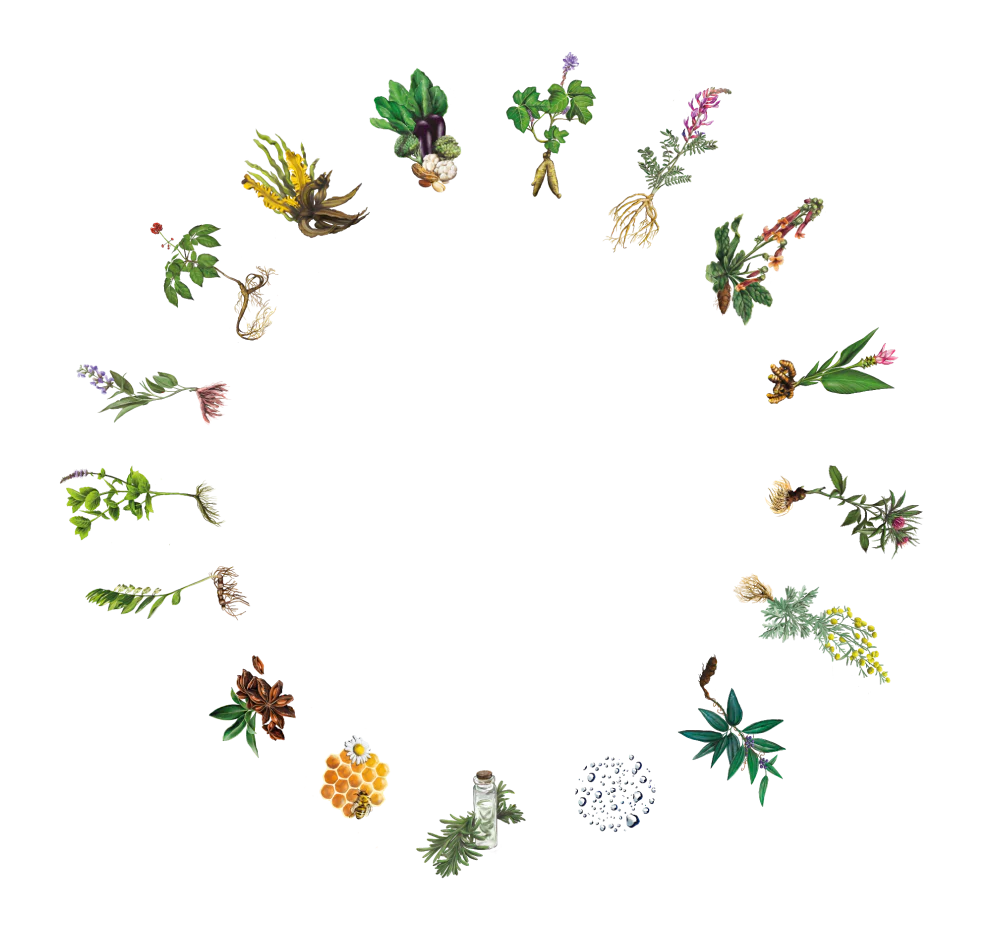 Purified Spring Water, 100% Organic Raw Mesquite Honey, Peppermint - Mentha, Piperita (Leaves), Astragalus - Astragalus Membranaceus (Root), Artemisia Capillaris Tunb, (Aerial Parts), Turmeric - Curcuma Longa (Root), Polygonatum - Polygonatum Odoratum (Root), Salvia Pratensis (Root), Poria - Wolfiporia Cocos (Whole Plant), Atractylodes Ovata (Root), Rehmannia Glutinosa (Root), Kudzu - Pueraria Lobata (Root), Asian Ginseng Extract Ultra Red - Panax Ginseng (Root), Choline, Pacific Sea Kelp (Seanol®), Eckolnia Cava Kjellman (Brown Seaweed) Extract, Star Anise, Rosemary Essential Oil, 100% Natural Citric Acid.